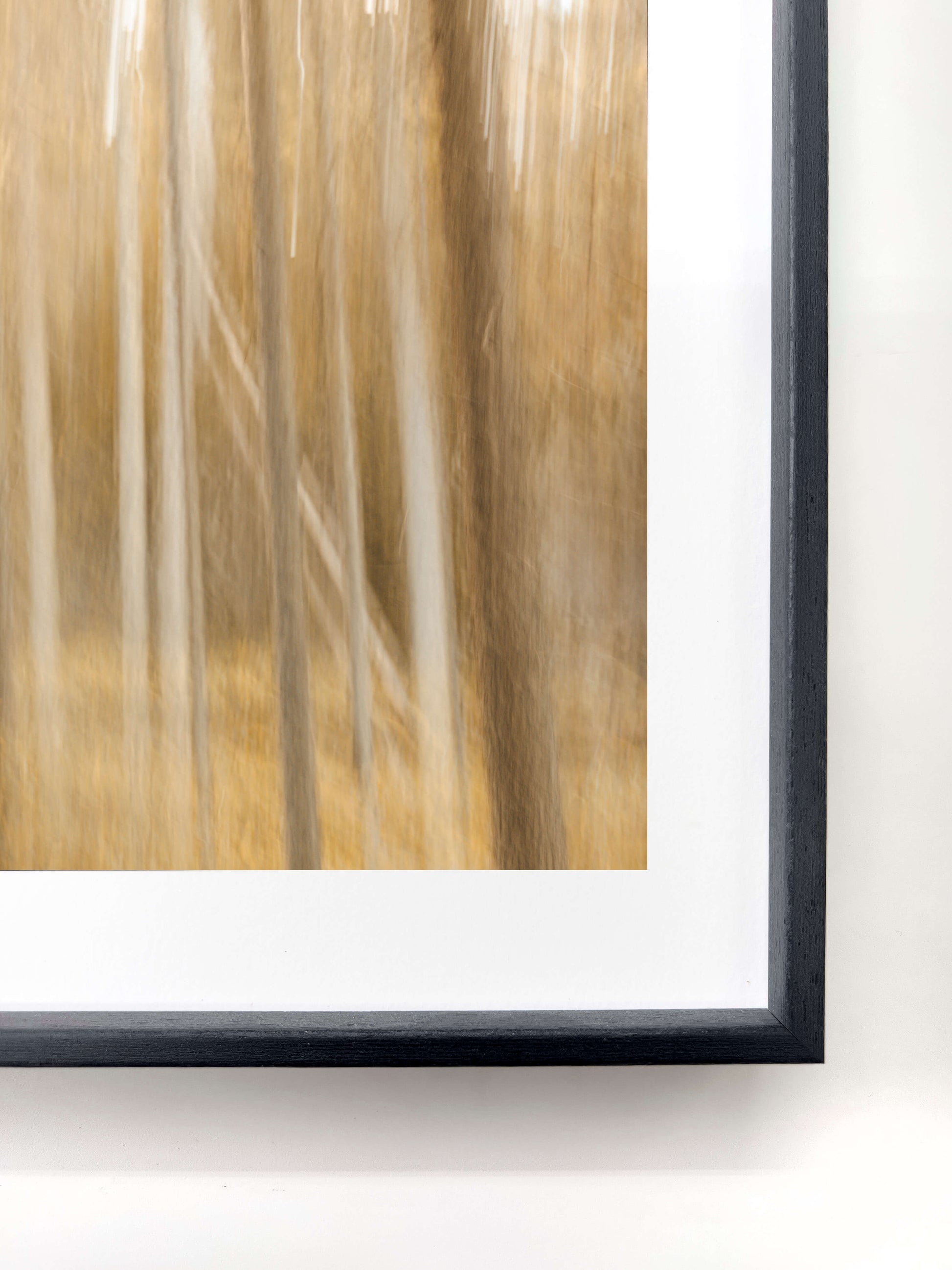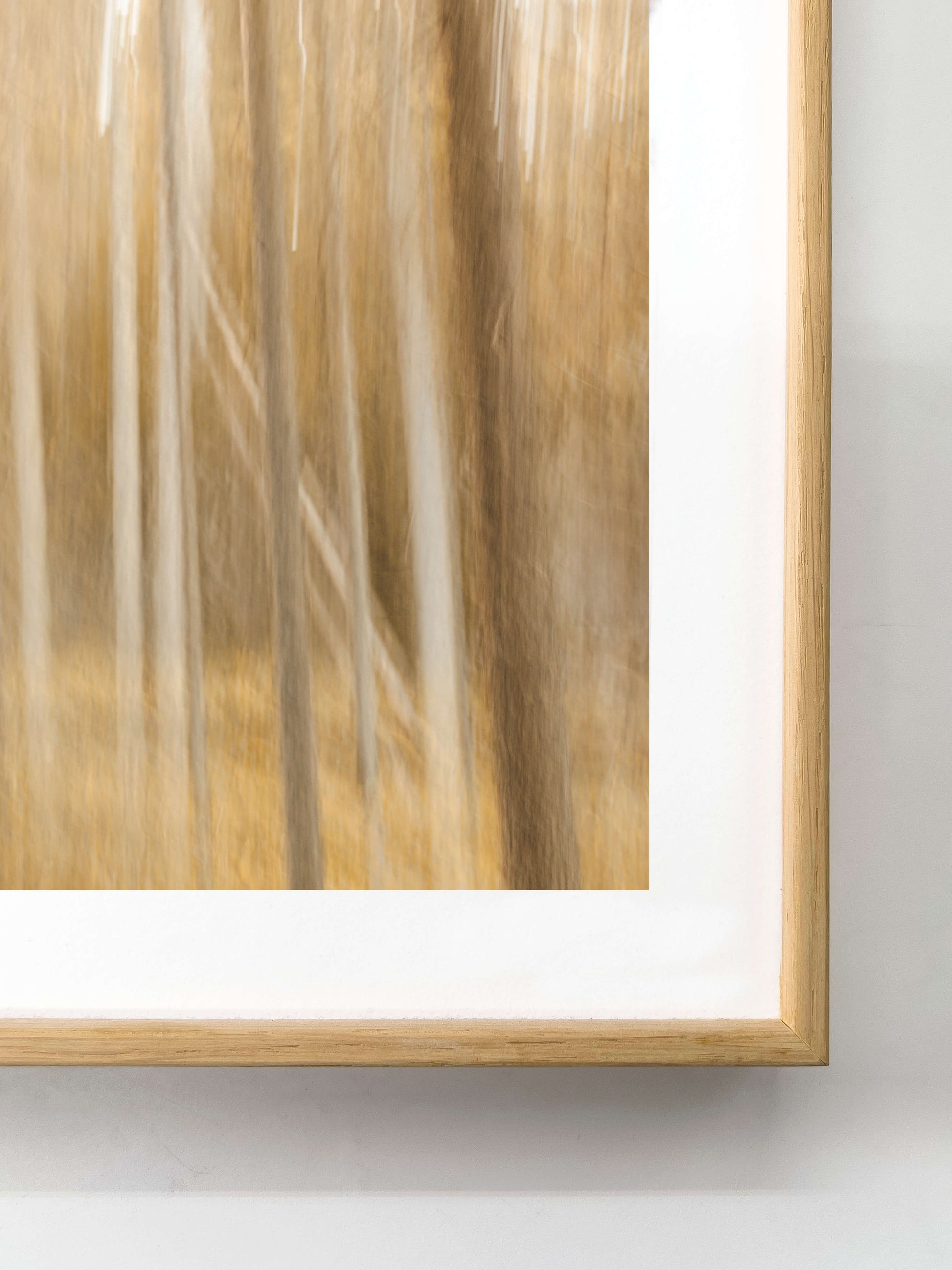Strength and warmth, held in balance. Each frame unites the clean precision of aluminium with the grounded calm of real wood. Available in anthracite black or oak — tones that echo the forest and its shadows. Frames are shipped without glass for a more natural, gallery-like presence; UV-glass can be added later if desired. -