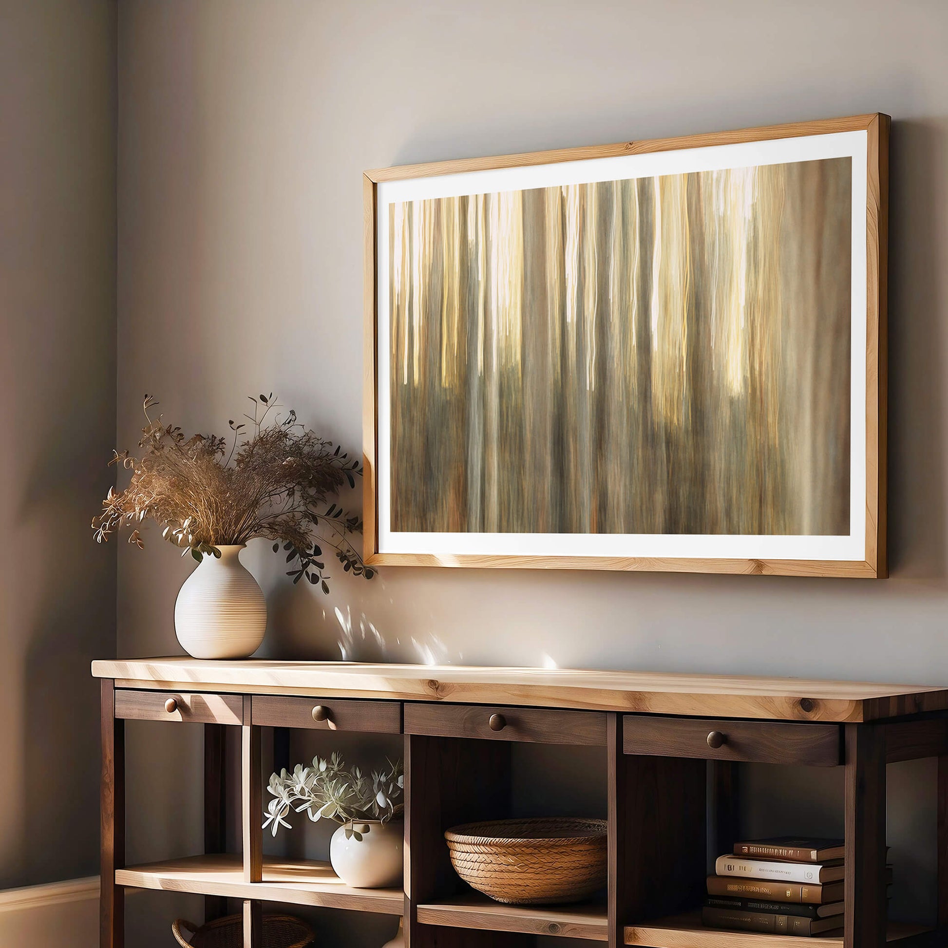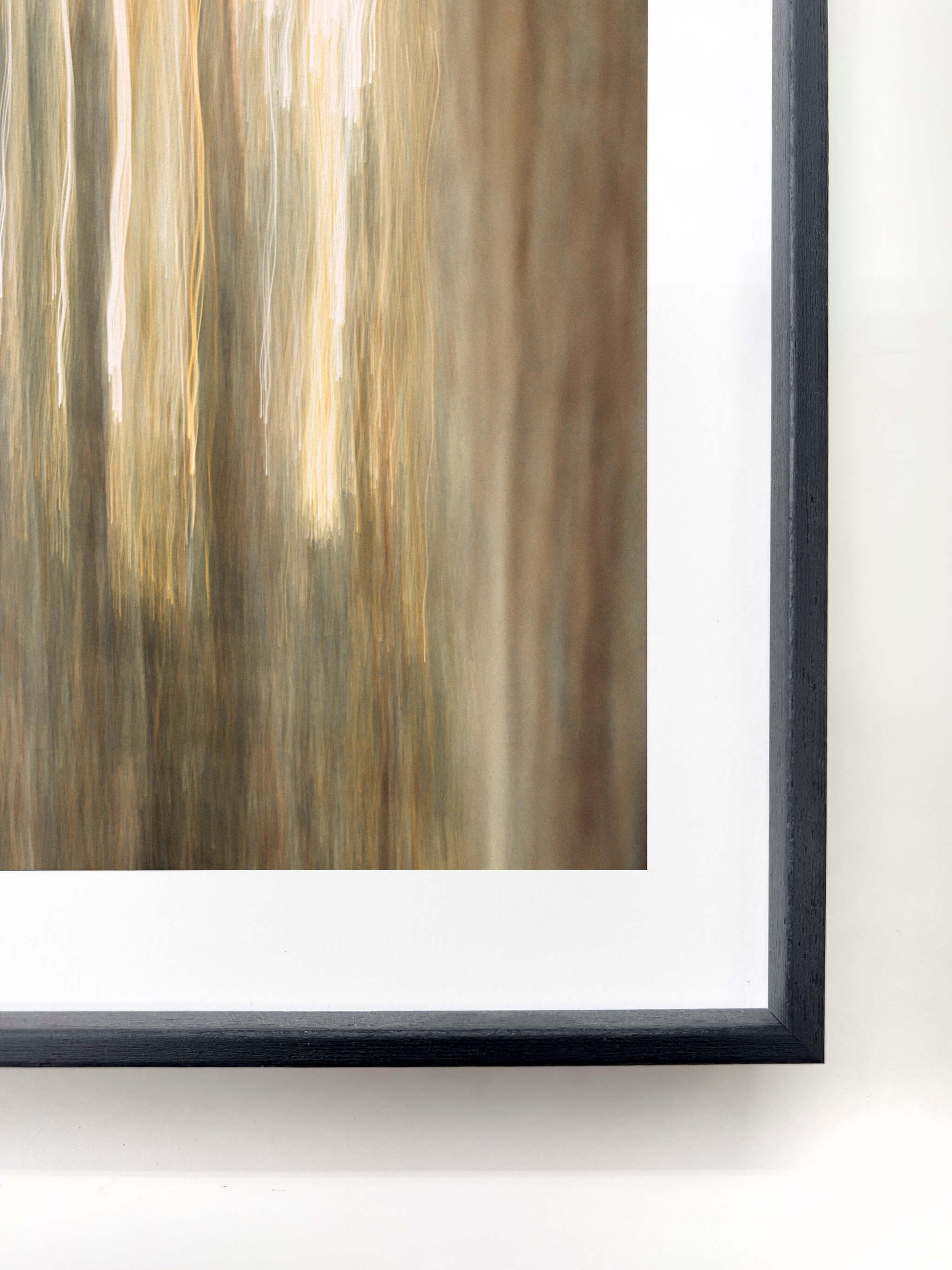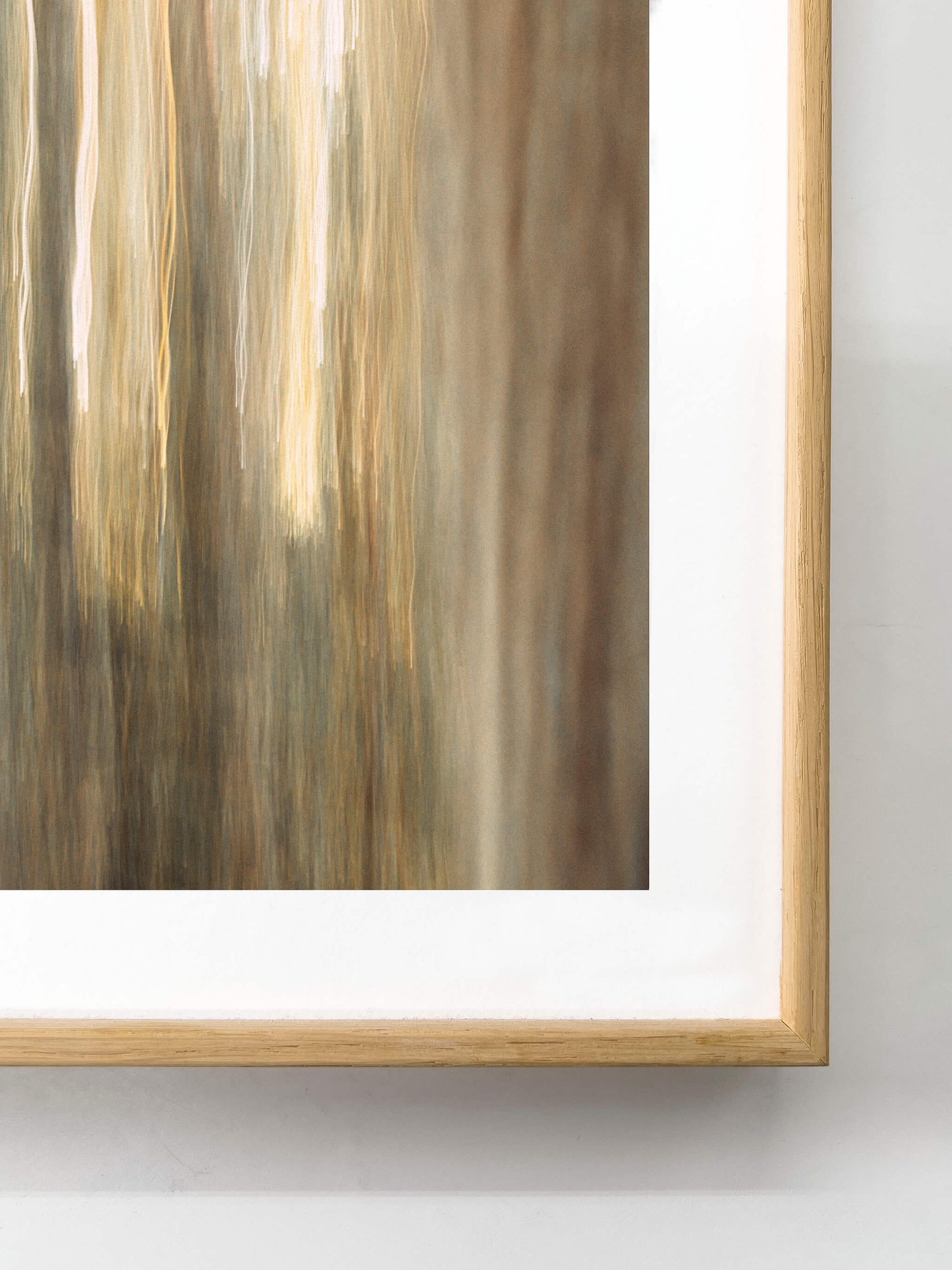 Strength and warmth, held in balance. Each frame unites the clean precision of aluminium with the grounded calm of real wood. Available in anthracite black or oak — tones that echo the forest and its shadows. Frames are shipped without glass for a more natural, gallery-like presence; UV-glass can be added later if desired. -