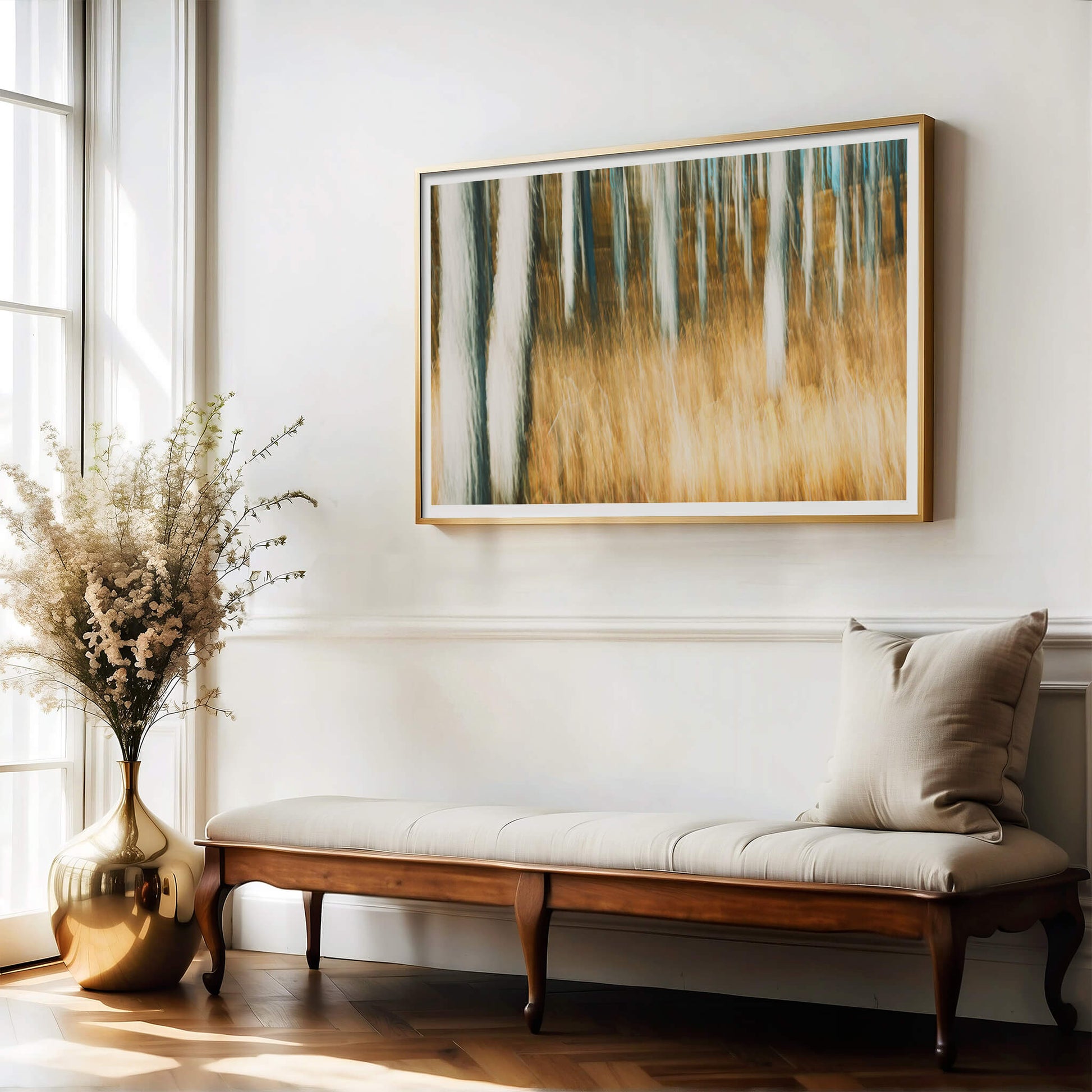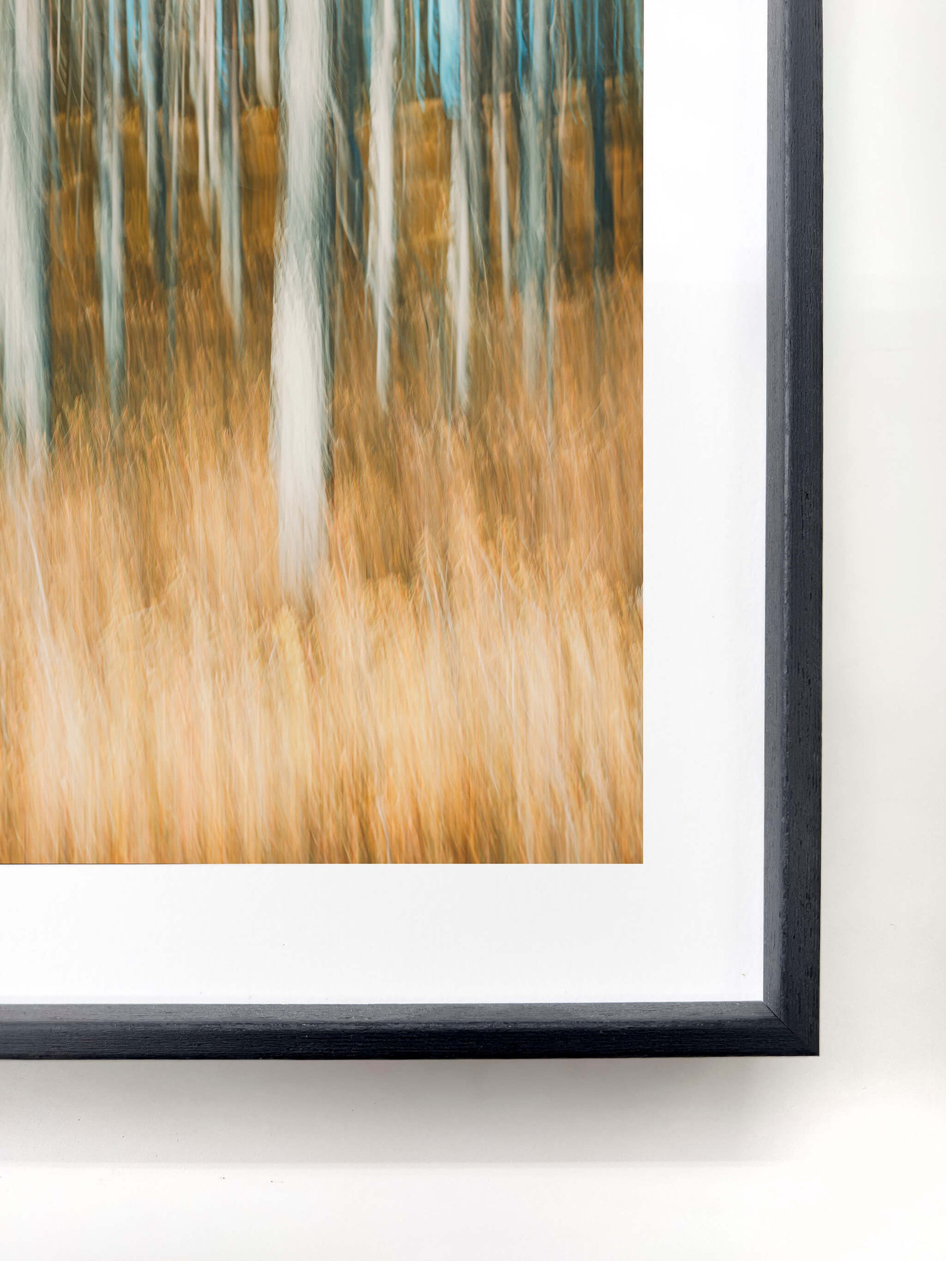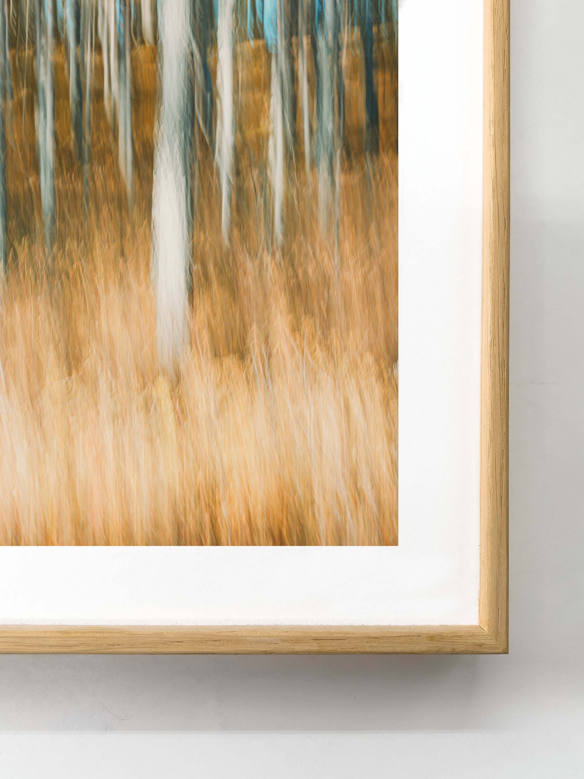 Strength and warmth, held in balance. Each frame unites the clean precision of aluminium with the grounded calm of real wood. Available in anthracite black or oak — tones that echo the forest and its shadows. Frames are shipped without glass for a more natural, gallery-like presence; UV-glass can be added later if desired. -