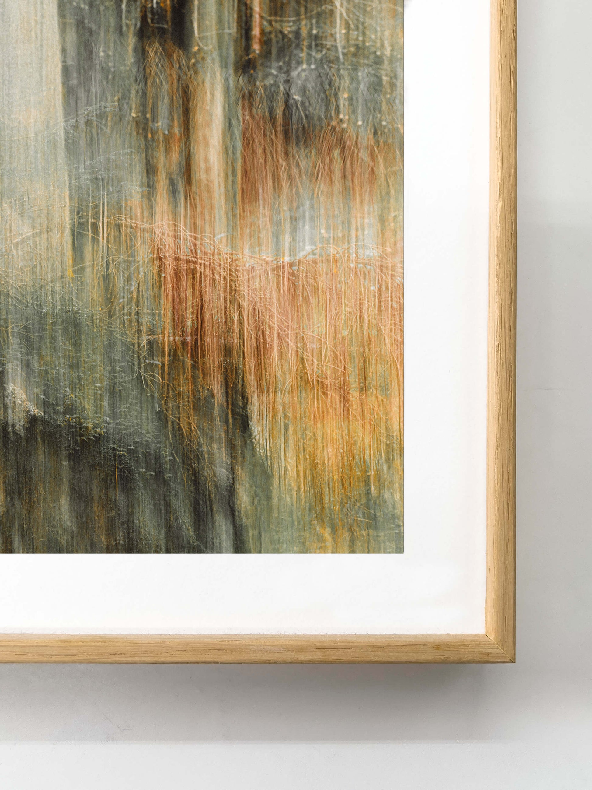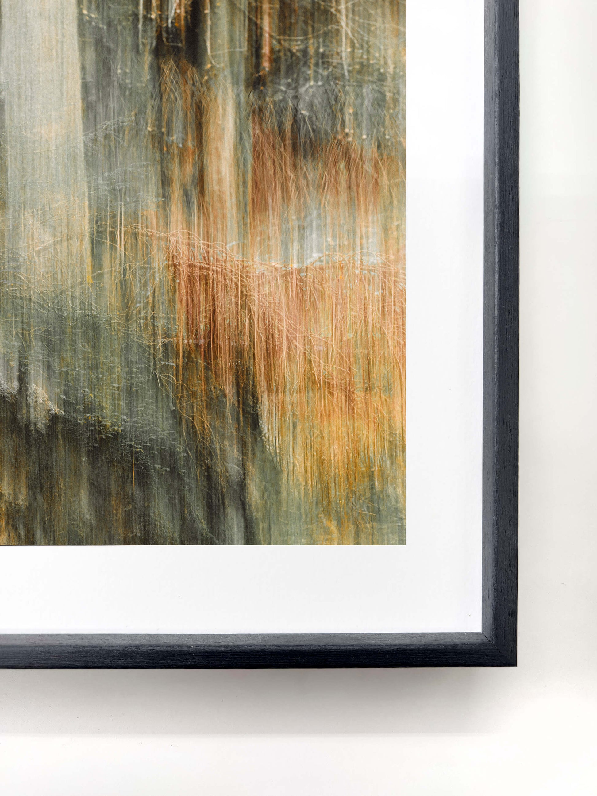Strength and warmth, held in balance. Each frame unites the clean precision of aluminium with the grounded calm of real wood. Available in anthracite black or oak — tones that echo the forest and its shadows. Frames are shipped without glass for a more natural, gallery-like presence; UV-glass can be added later if desired. -