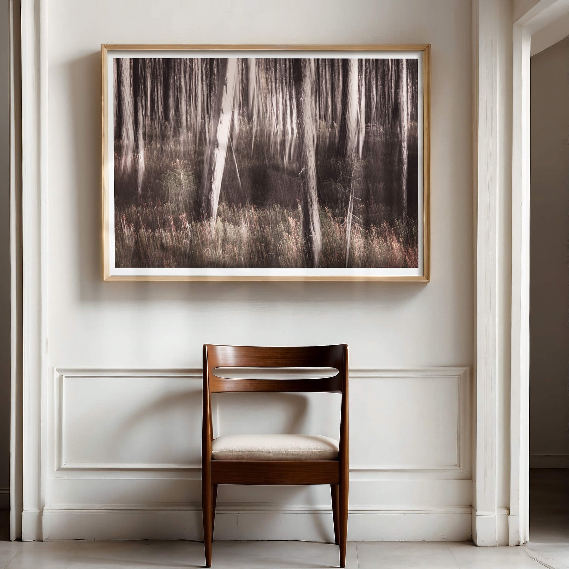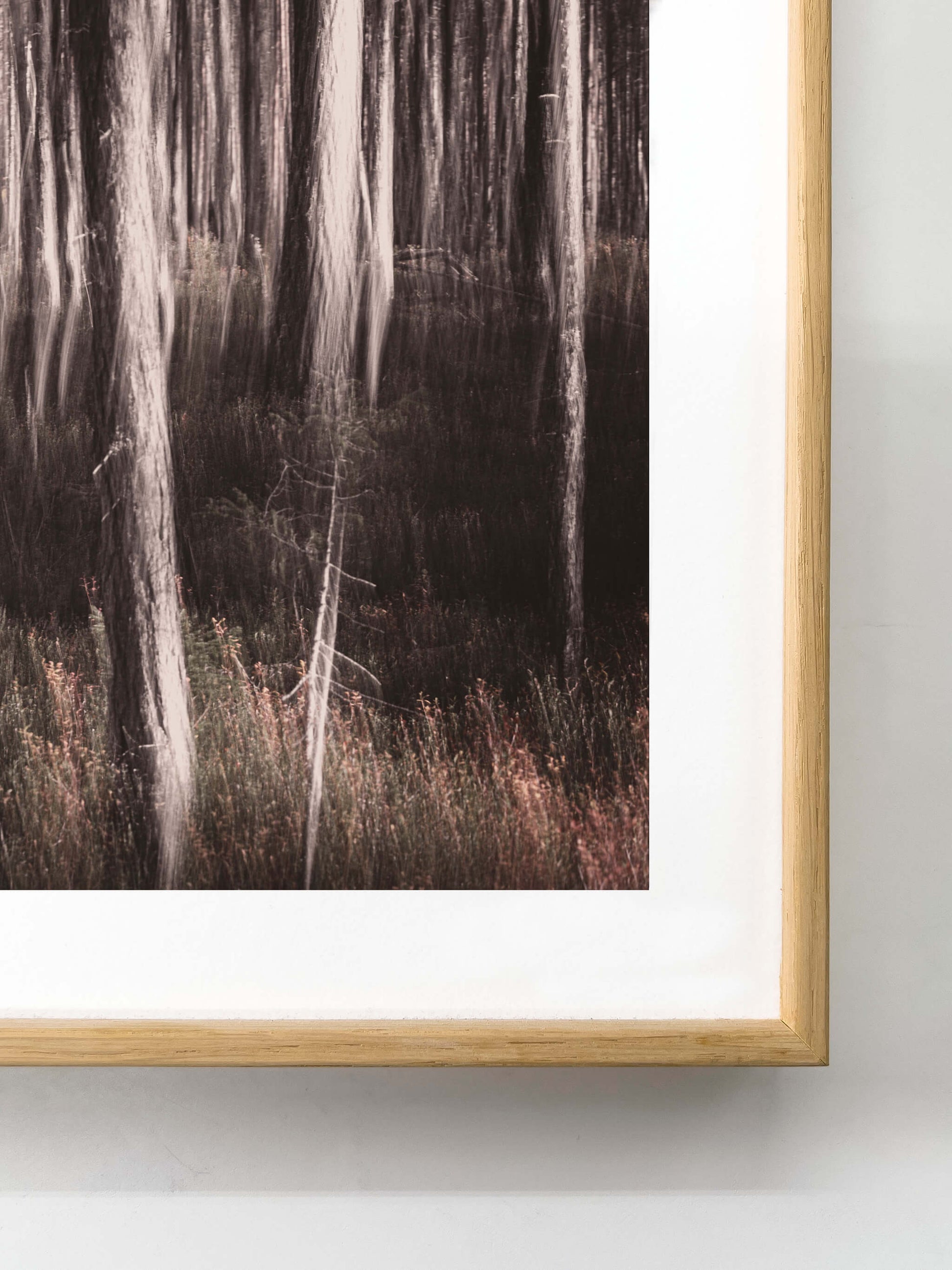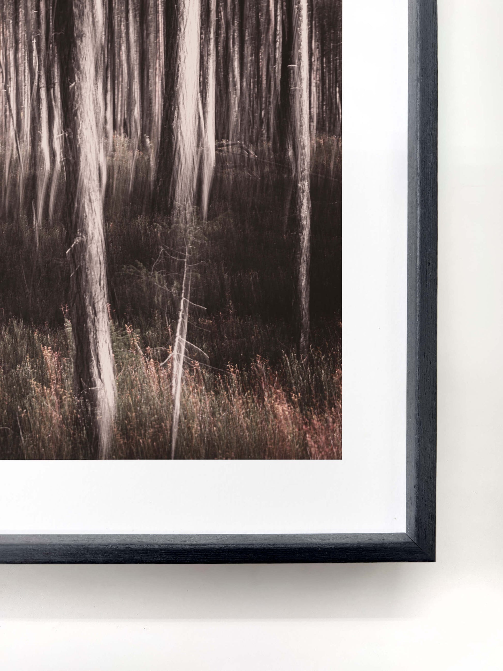 Strength and warmth, held in balance. Each frame unites the clean precision of aluminium with the grounded calm of real wood. Available in anthracite black or oak — tones that echo the forest and its shadows. Frames are shipped without glass for a more natural, gallery-like presence; UV-glass can be added later if desired. -