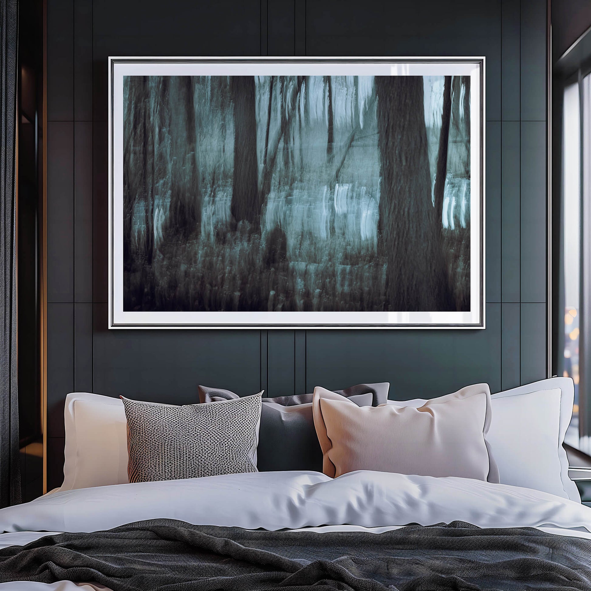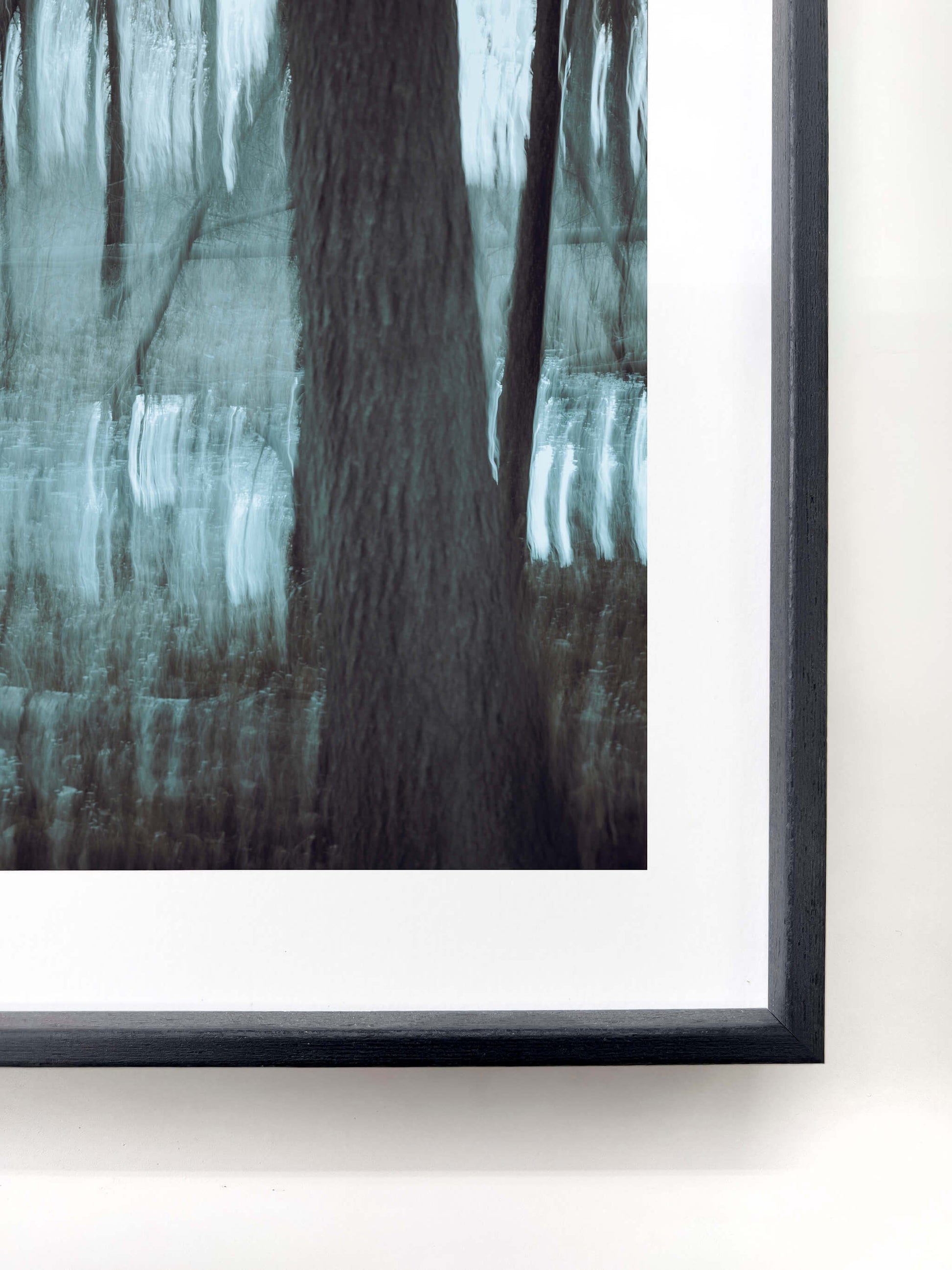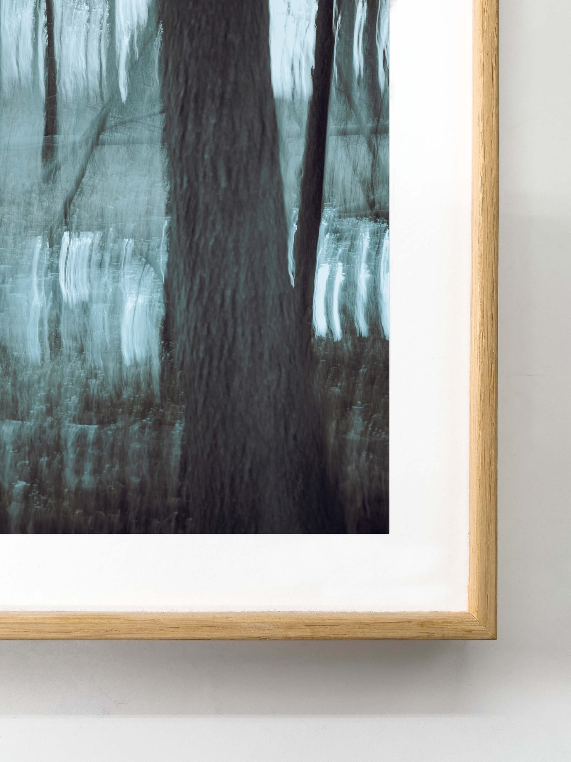 Strength and warmth, held in balance. Each frame unites the clean precision of aluminium with the grounded calm of real wood. Available in anthracite black or oak — tones that echo the forest and its shadows. Frames are shipped without glass for a more natural, gallery-like presence; UV-glass can be added later if desired. -